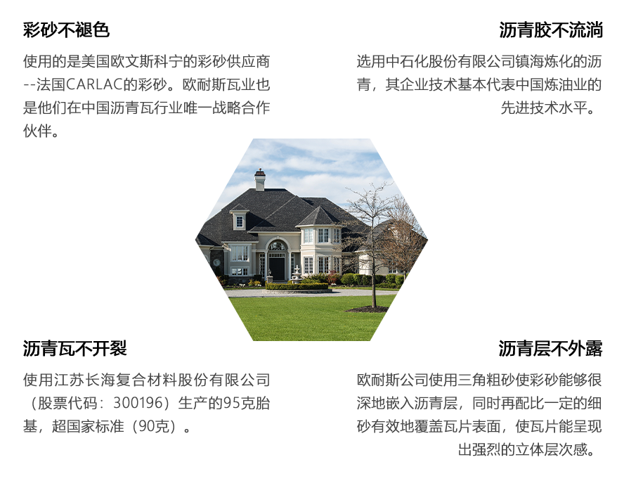 - 瀝青瓦不開裂使用江蘇長海復合材料股份有限公司(股票代碼:300196)生產的95克胎基,超國家標準(90克)。